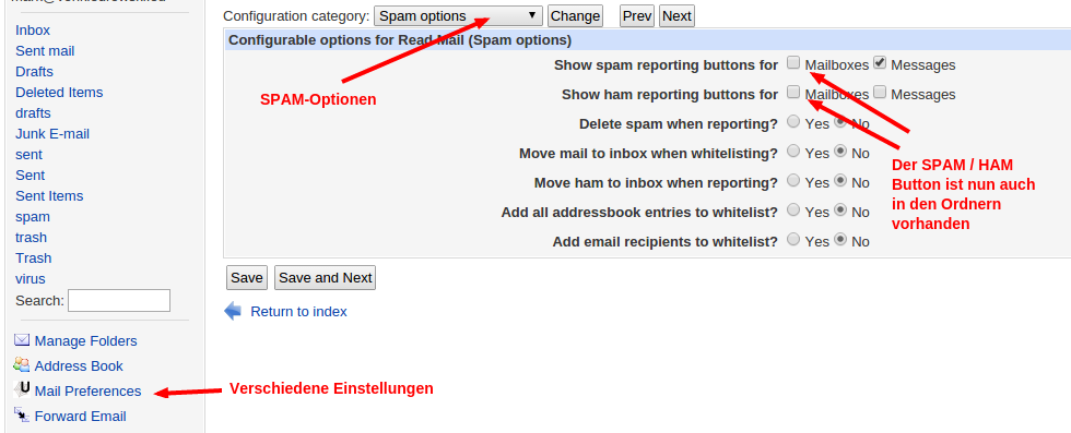 Sollten Sie jedoch einmal sehr viel Spam bekommen, können Sie auch den „Report Spam“ oder „Report Ham“ Button auf die Übersicht der einzelnen Ordner setzen.