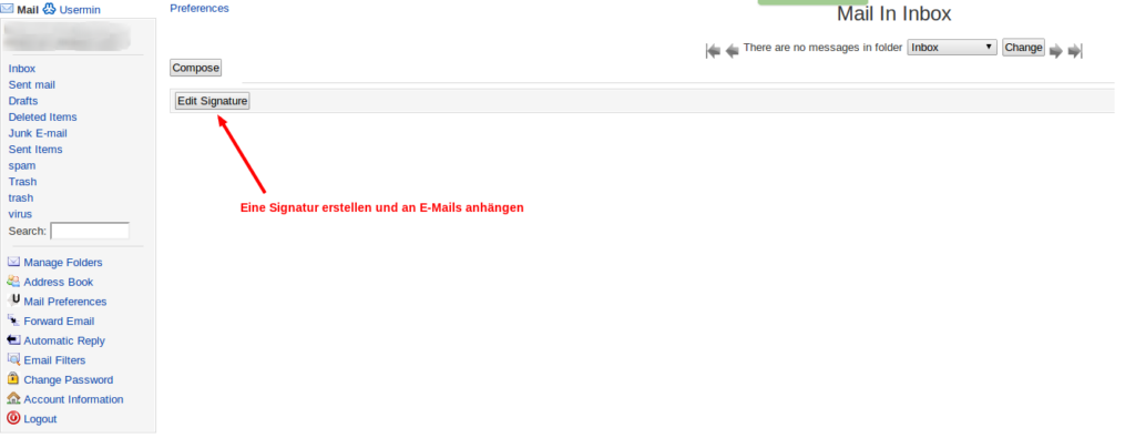 Um eine Signatur (einen Textanhang am Ende einer E-Mail) zu erstellen, müssen Sie nur die „Inbox“ auswählen und danach auf den Button „Edit Signature“ klicken. Im anschließenden Freifeld können Sie dann Ihre Signatur eingeben.