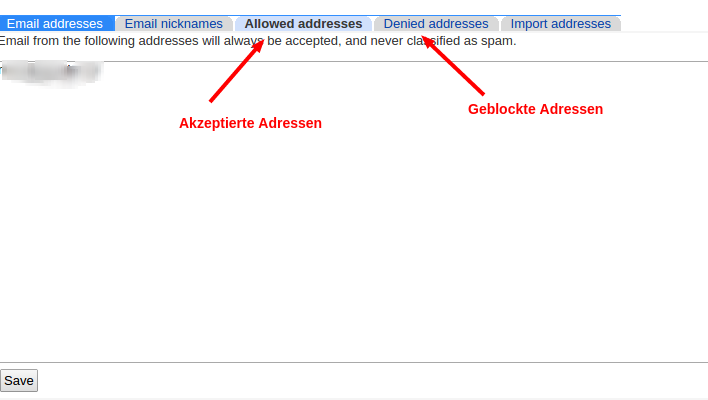 Mit Hilfe des Adressbuchs können Sie nicht nur Ihre Bekannten speichern, sondern auch E-Mail-Adressen blocken, bzw. freischalten. Manchmal erkennt der Webmailer eine Mail (häufig einen Newsletter) als Spam, obwohl Sie genau diese Mail erhalten wollten. Um dies zu verhindern können Sie die E-Mail-Adressen unter „Allowed addresses“ eingeben. Mails von dieser Adresse werden danach nie wieder als Spam erkannt. Mails von unliebsamen Absendern können Sie blocken, indem Sie diese unter „Denied adresses“ eintragen. Dadurch wird jede Mail, die von diesem Absender kommt, direkt in den Spam-Ordner verschoben.